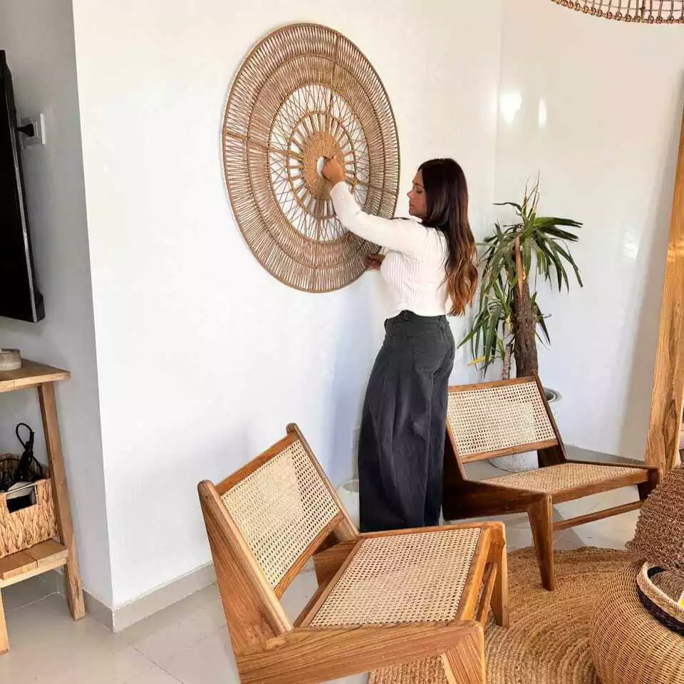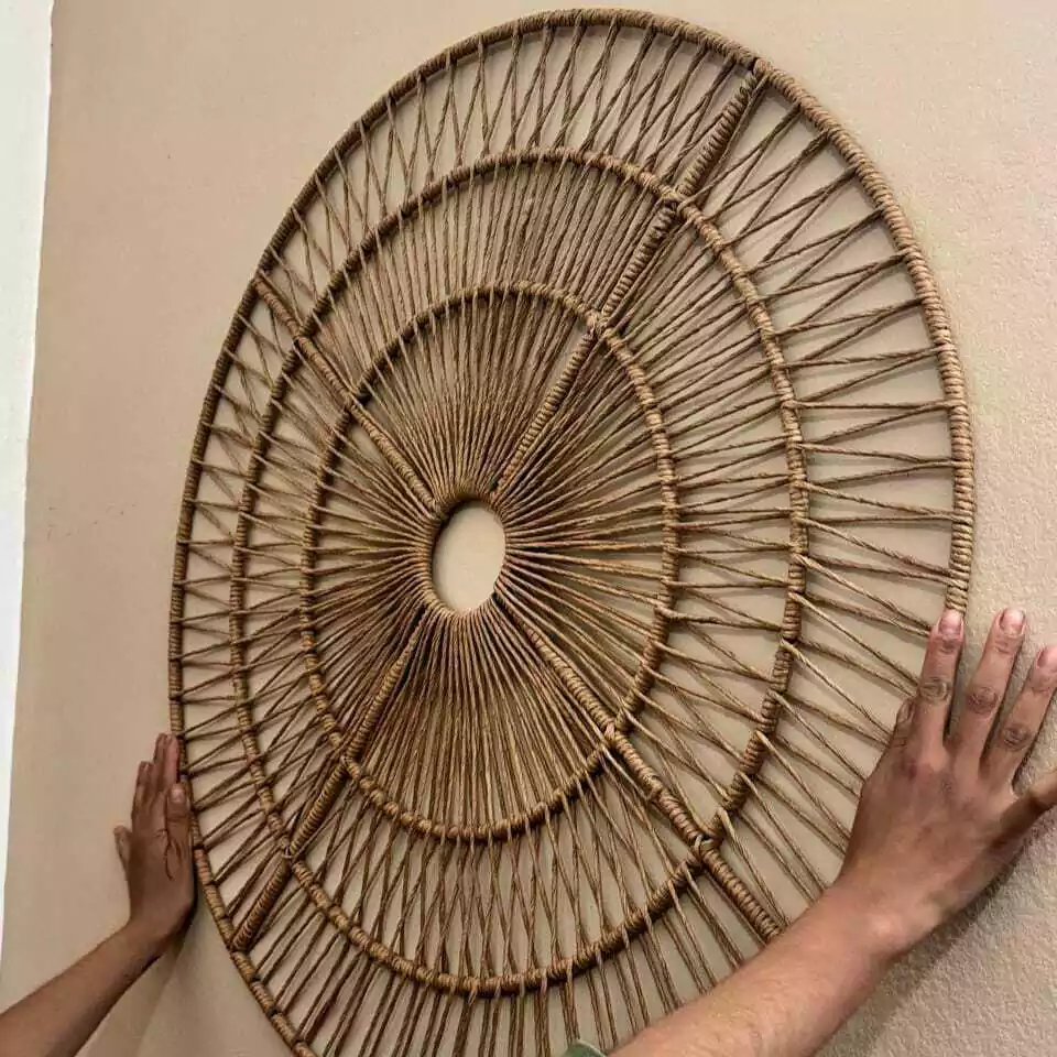 Adorno Sol tramado artesanalmente en hilo Kraft con una estructura de hierro.