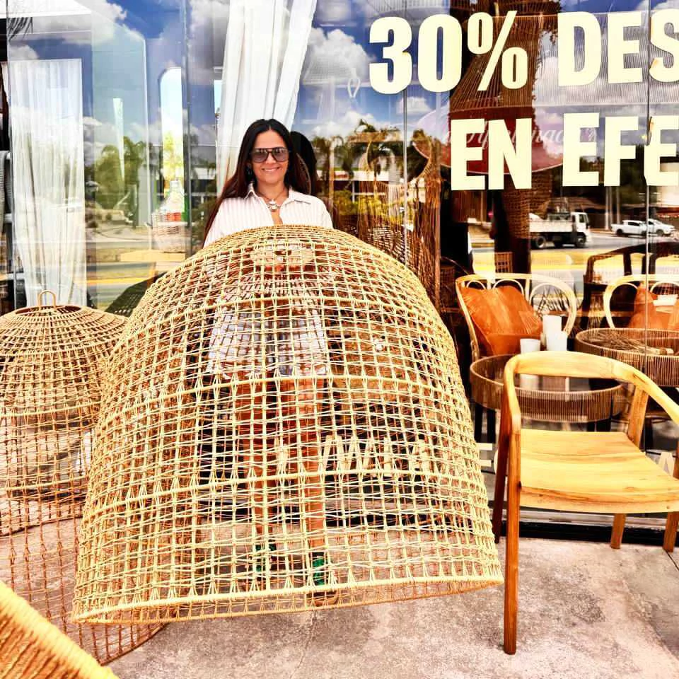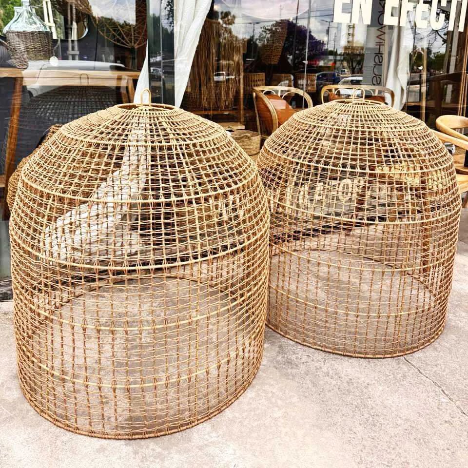 Lámpara BOMBA tramada artesanalmente en hilo Kraft con una estructura de hierro de 90cm de diámetro y 90 cm de alto