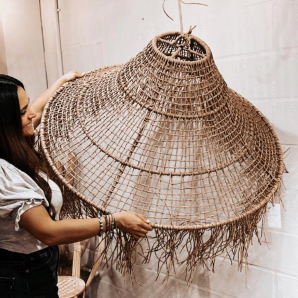 Lámpara Tropical tramada artesanalmente en hilo Kraft con una estructura de hierro de 6 mm.