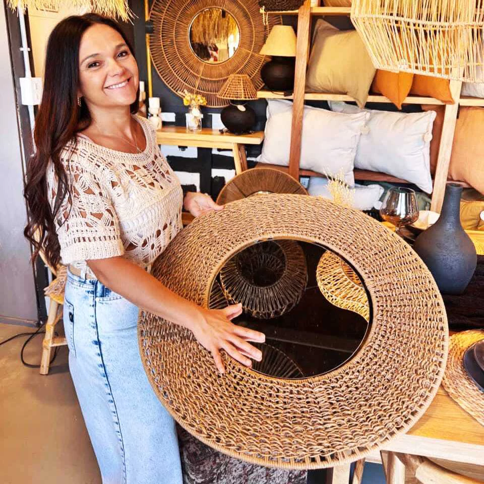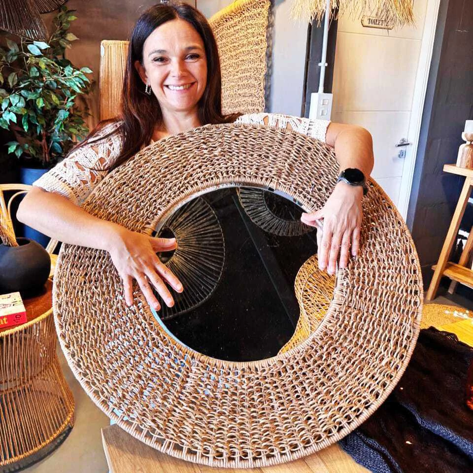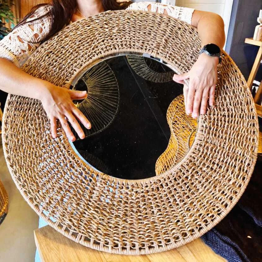 Workshop Presencial de Espejo Gloria, el día del curso vos elegis el modelo y color. Vamos a encordar y tejer con hilo Kraft de 4 y de 2mm que hoy por hoy es la fibra número 1 en decoración.